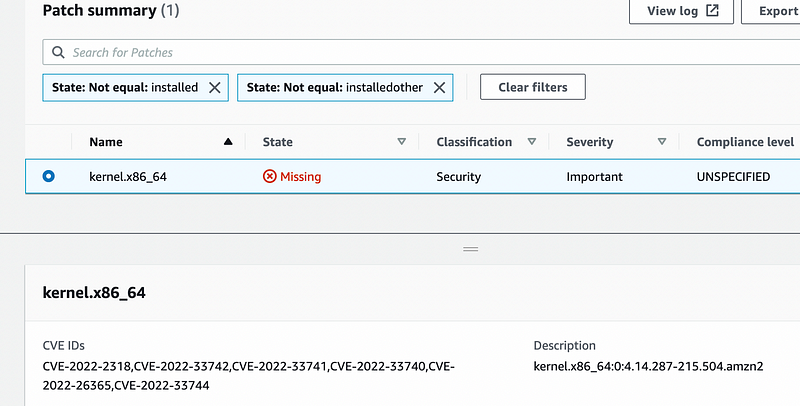 Clicking into the “Security non-compliant count” for the instance, you are brought to the Patch Manager reporting page with a list of what is making the instance not compliant. In this case, it’s a kernel update.