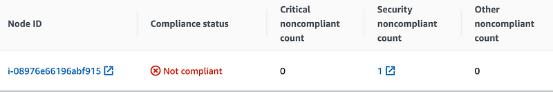 Clicking the “1” for “Nodes with missing patches”, you are brought to a list of the status and what exactly is not compliant. This makes for a great artifact for various audits and can be turned directly into actionable work by clicking the number of non-compliant items for an instance.