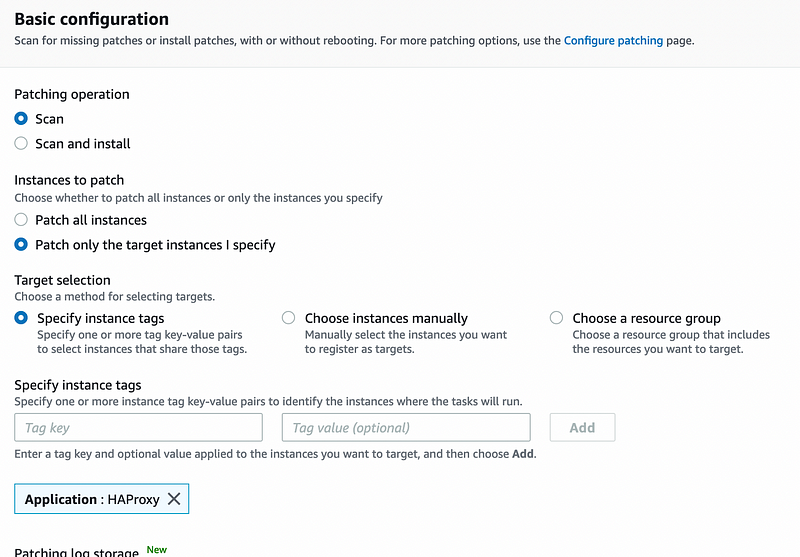 Once your inventory is set up you can run your first patch job immediately using the “Patch Now” button. The basic settings are very straightforward. You can elect to only scan the instances selected or you can scan and install patches. Additionally, there are several options for filtering targets. If you want to store the logs in S3, you are given an option to do so from this page.