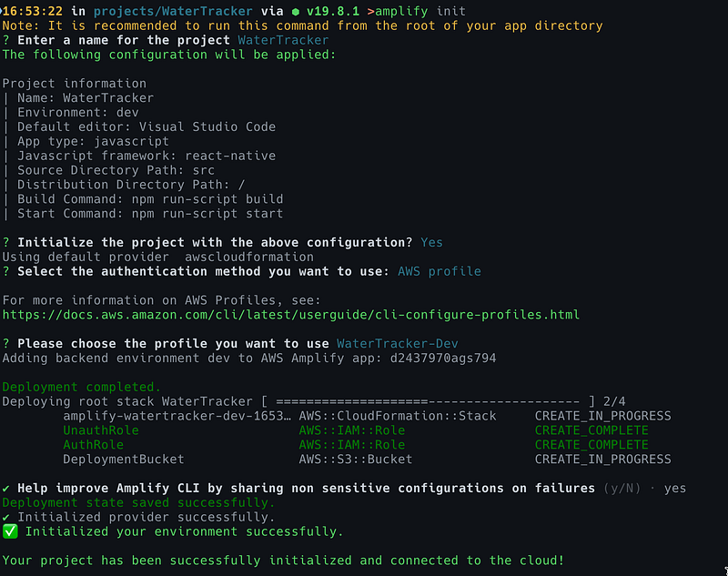 When creating an Amplify project, I was impressed with the CLI that the Amplify team maintains. You can add storage, APIs, databases, and more using amplify add. After creating your project, you start a new Amplify project with amplify init, which walks you through several options for your app. The CLI does its best to figure out some values. For example, it knew I was building a React Native app and selected the appropriate framework.