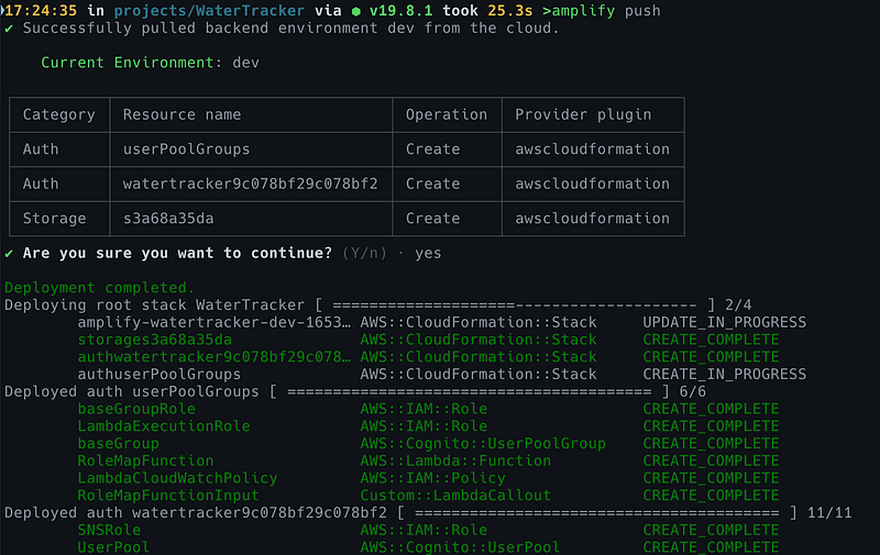 After adding various components using the add command, you deploy them with amplify push. This pushes your configuration to AWS, which deploys via CloudFormation. It's generally a smooth process and simplifies the Cloud infrastructure components so an app developer can focus on building their app using their language of choice.