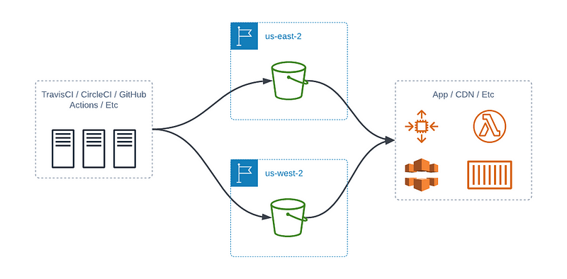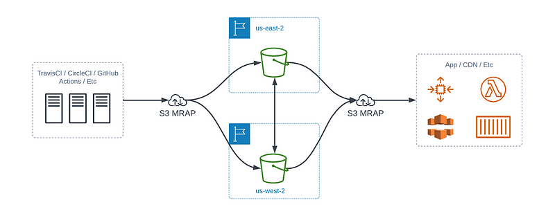 Your artifact building pipeline pushes the artifact to two (or more) buckets that are tied together with a multi-region access point. The buckets use bi-directional replication, and from there, your deployment tool uses the same access point to deploy the code. This method has the additional safety of continued operations even if a region’s S3 service is down.