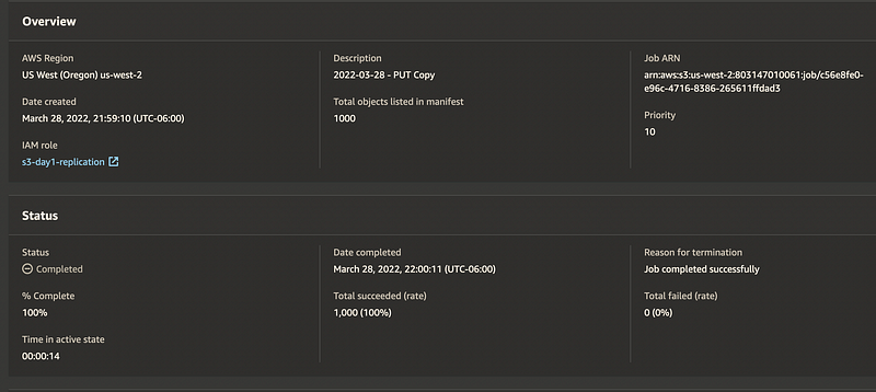 After the job is created, it will run through a series of checks and then wait for your confirmation before executing. After confirmation, the job starts, and you’re able to monitor the status from the job status page. It runs pretty quickly. In my sample, I copy 1,000 objects in 14 seconds. Admittedly they are essentially empty objects, but it is still pretty fast.